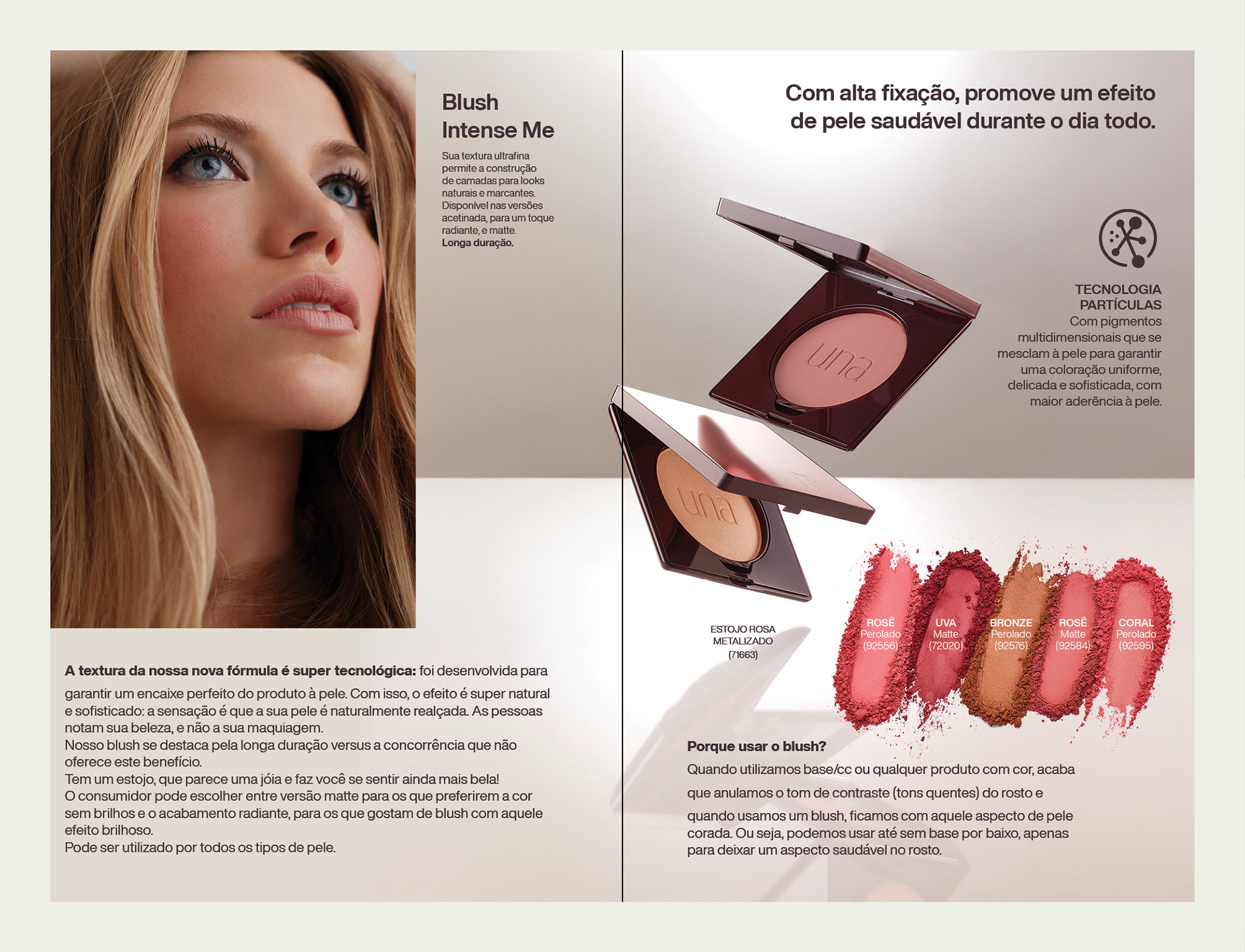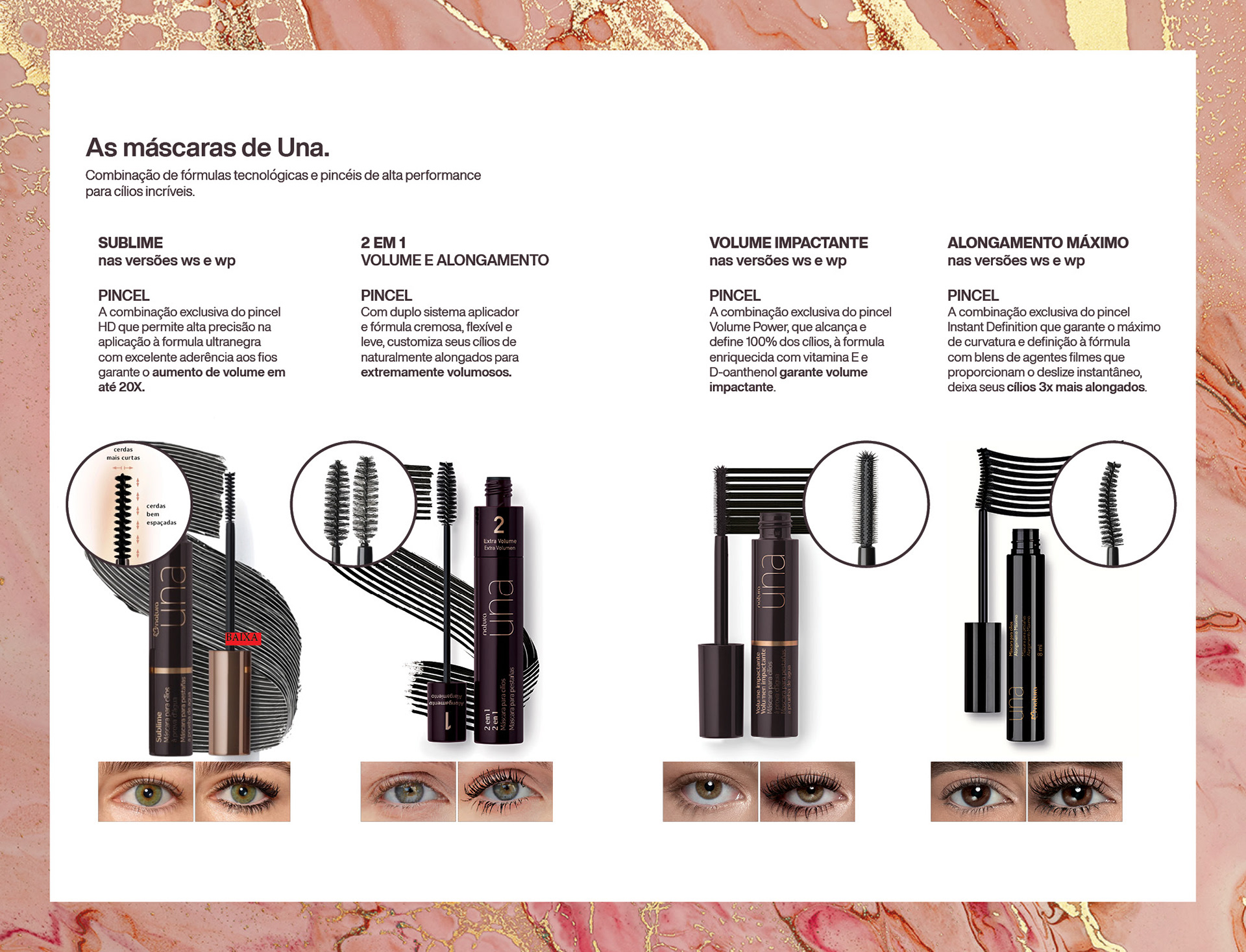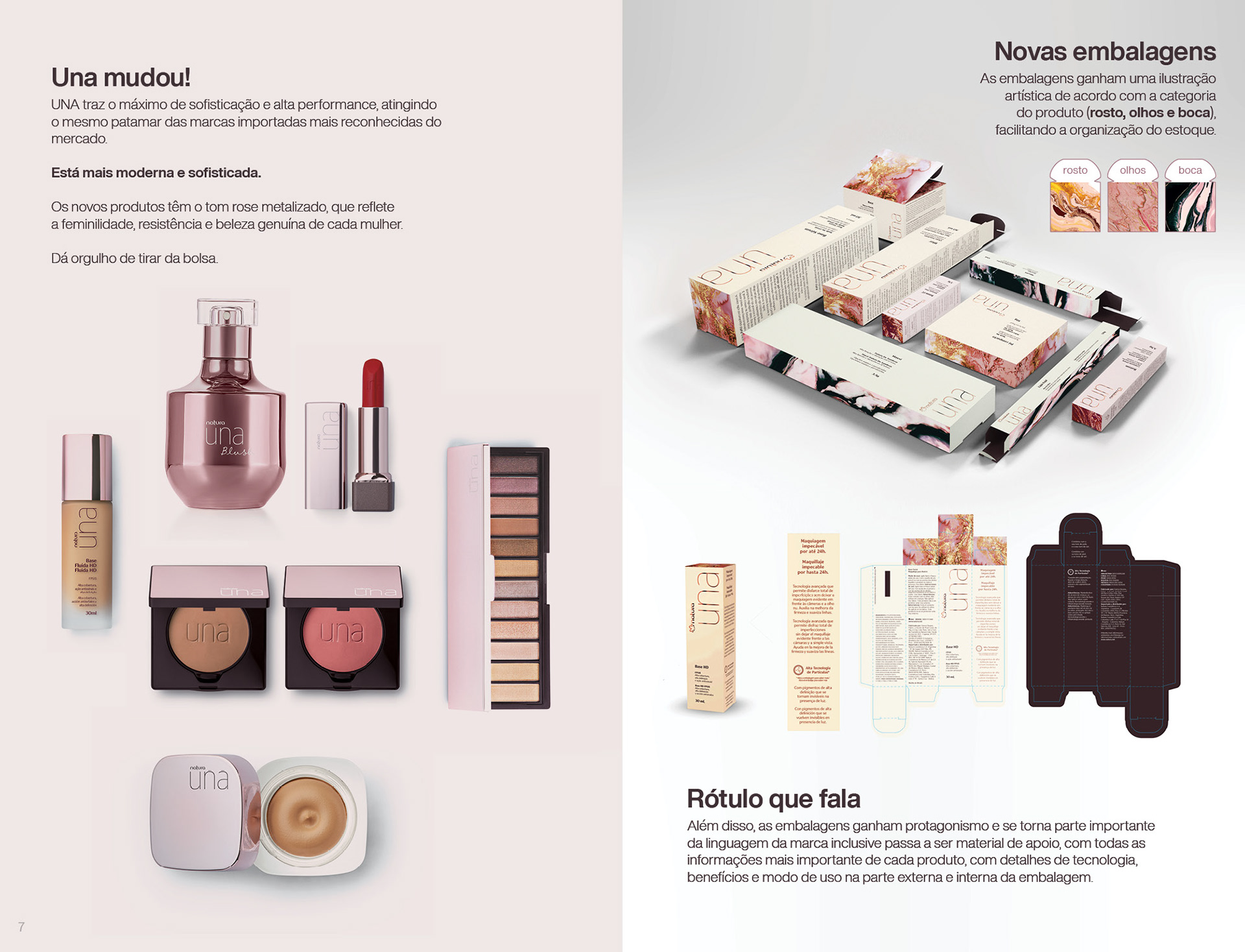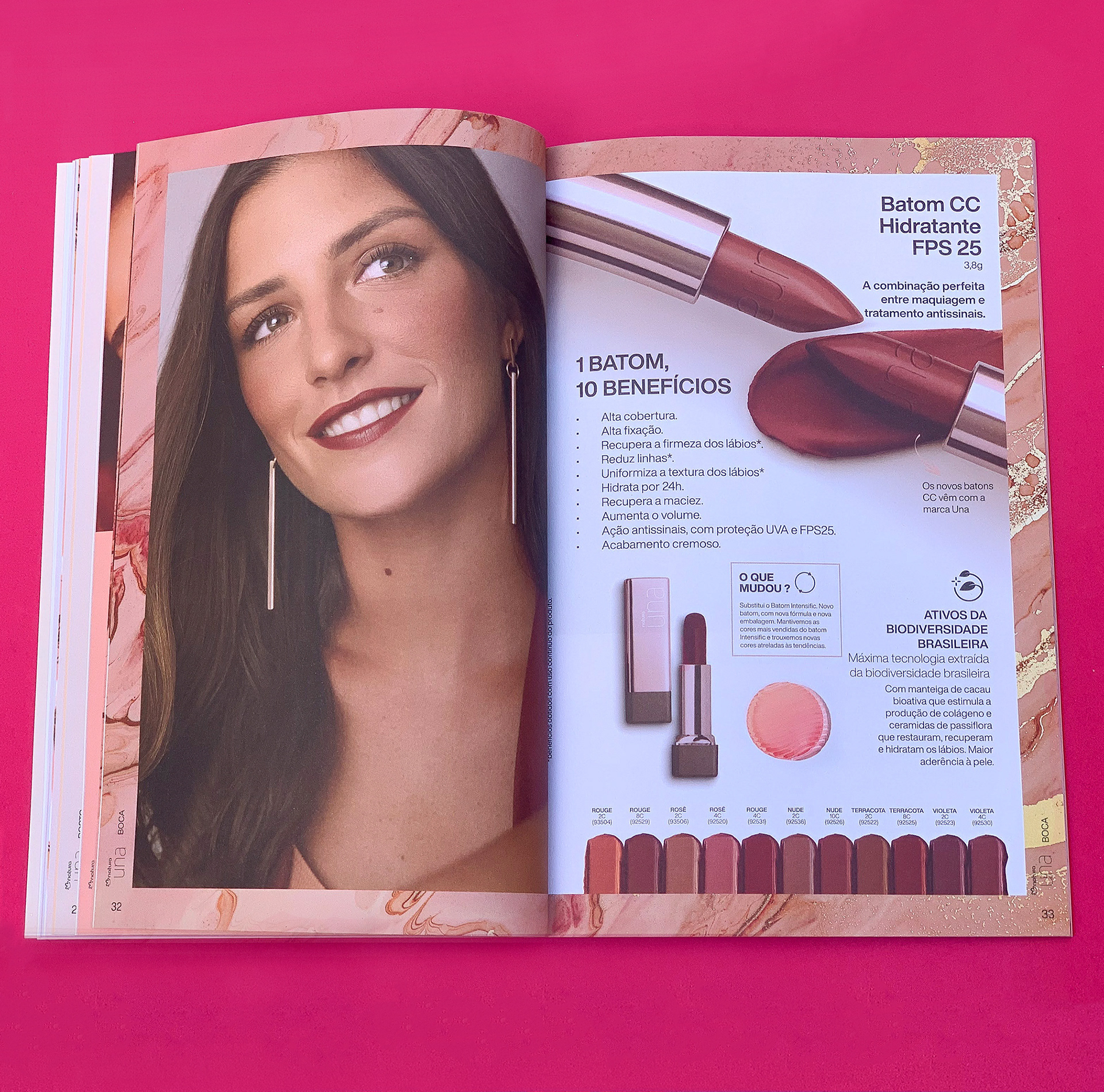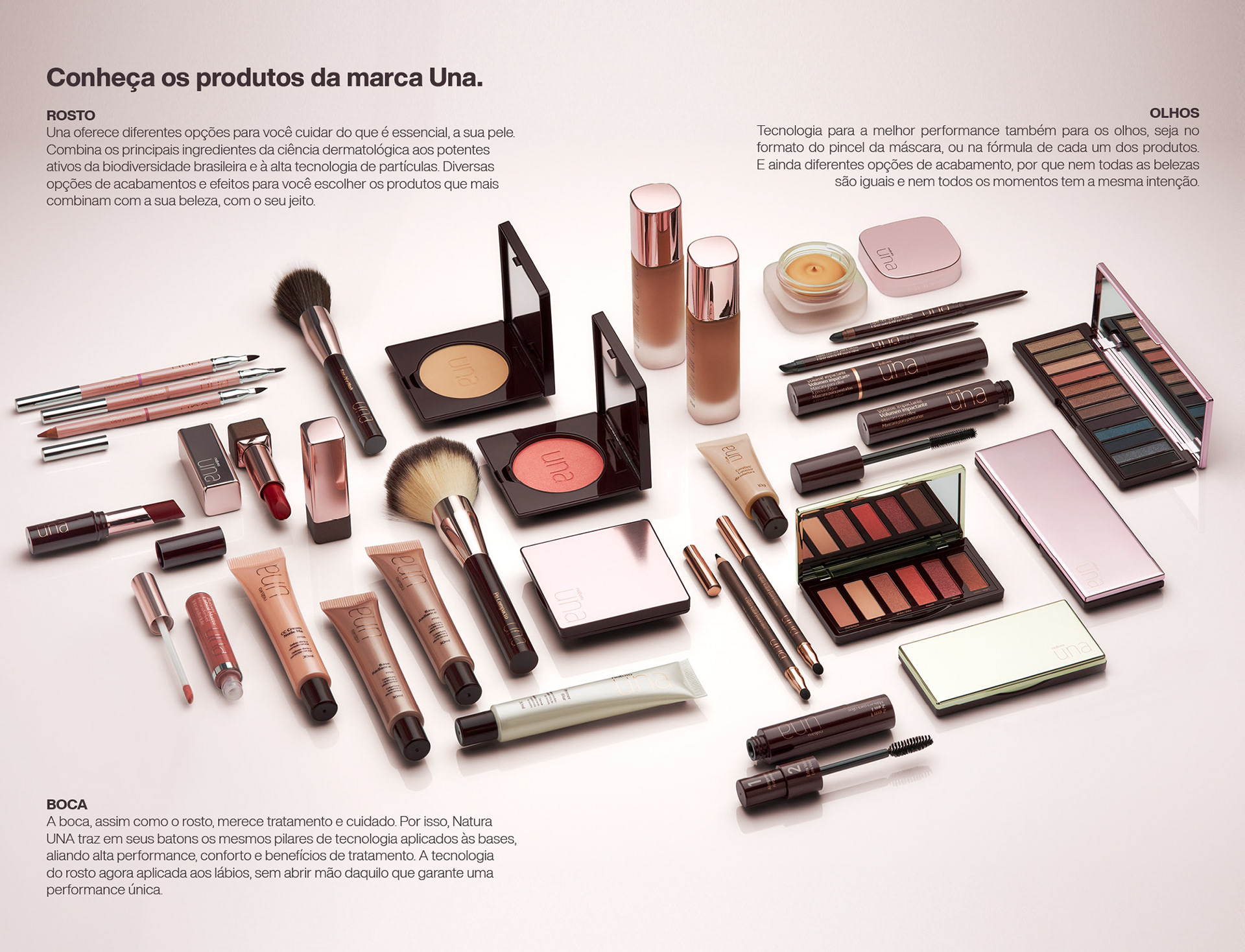 Direção de arte, diagramação e finalização para folheto do lançamento da linha UNA de maquiagens.