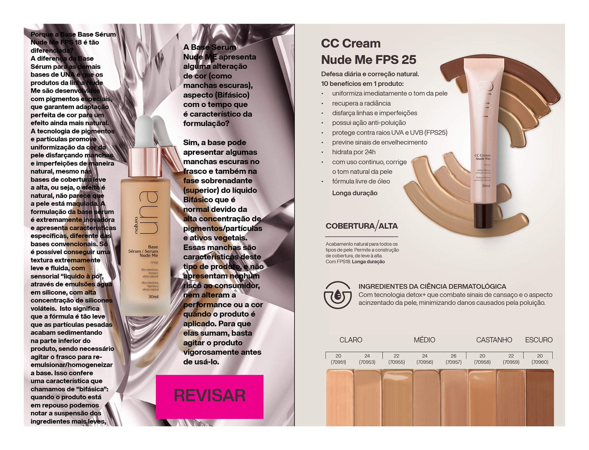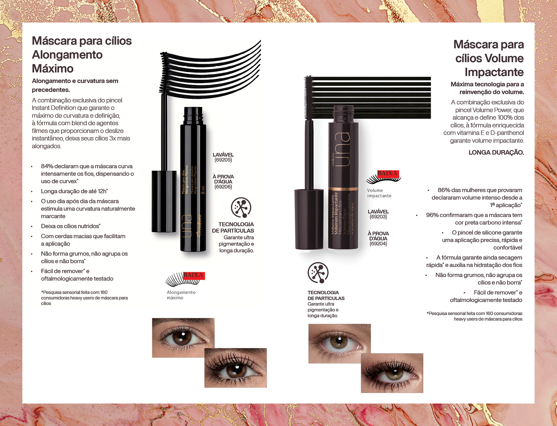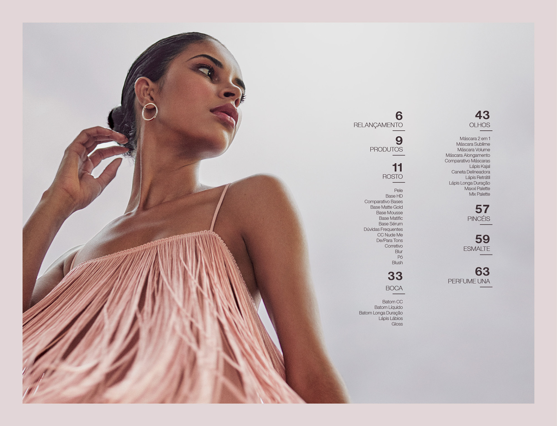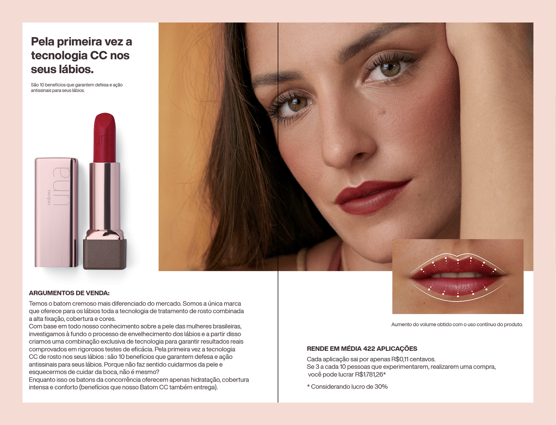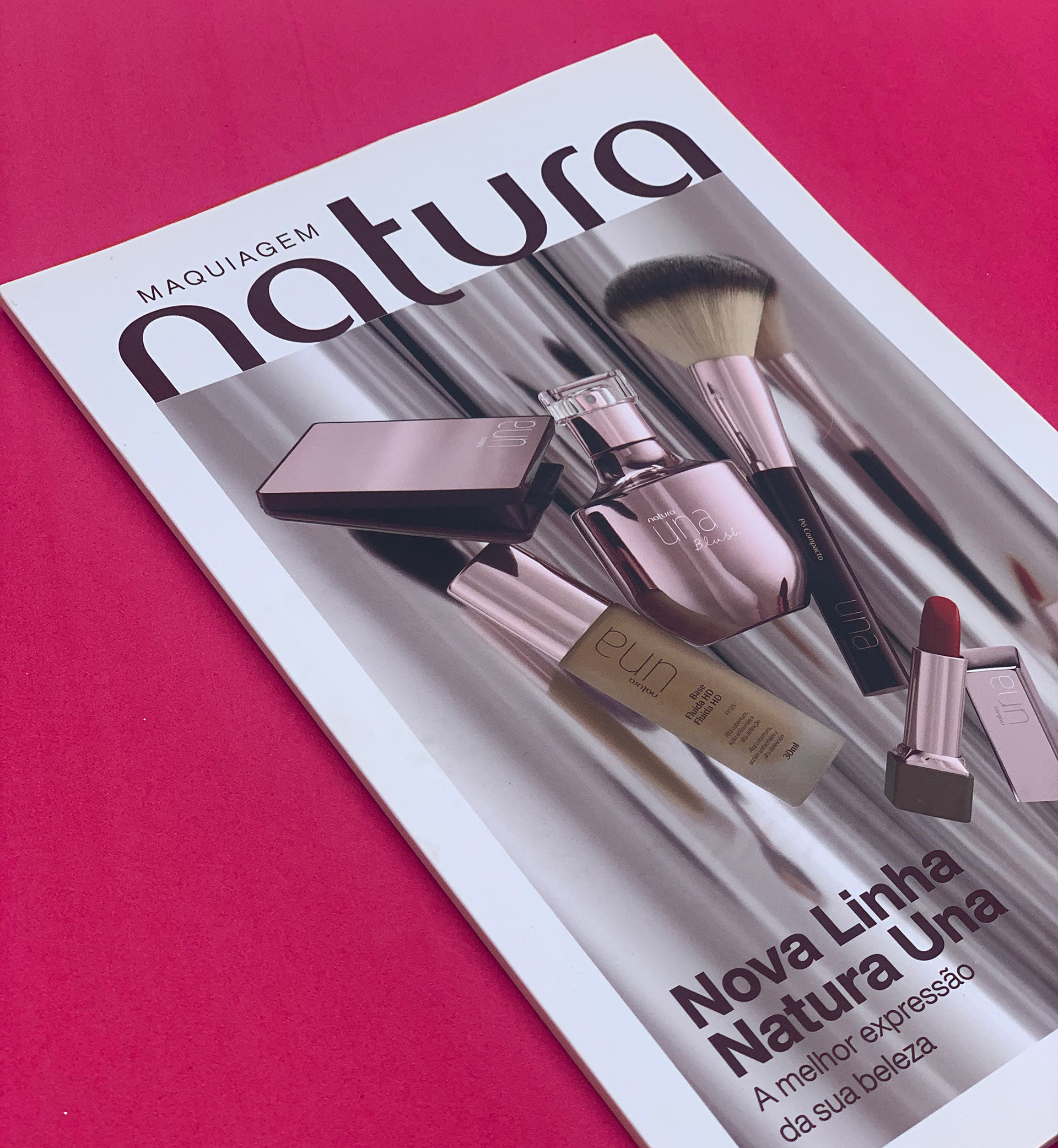 Direção de arte, diagramação e finalização para folheto do lançamento da linha UNA de maquiagens.